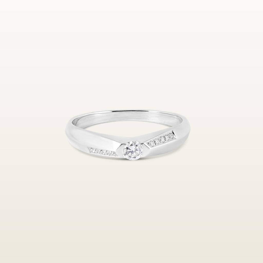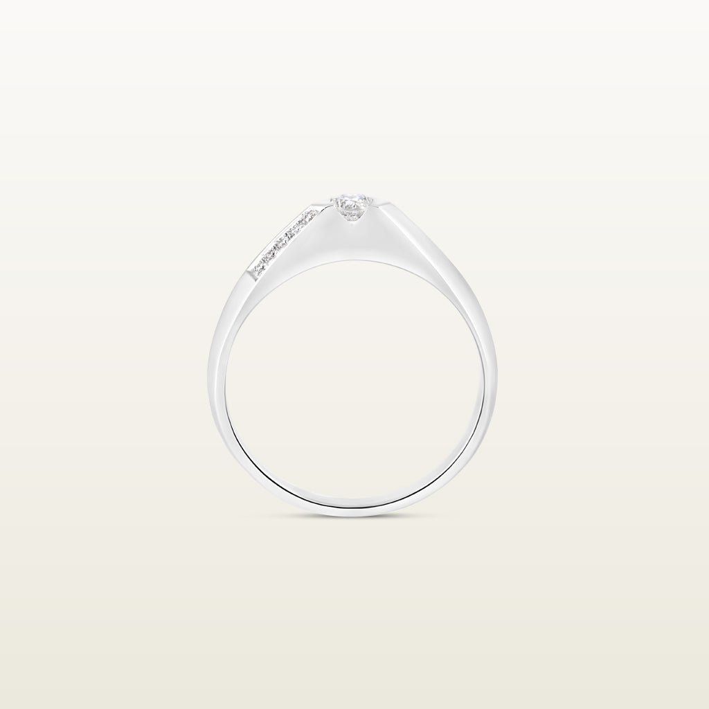 Anillo de compromiso Solitario, en oro blanco 18 kt con un diamante natural en el centro, corte Brillante Redondo (Round Brilliant Cut) de 0.13 ct. acompañado de 10 diamantes naturales laterales corte Brillante Redondo (Round Brilliant Cut) con un peso de 0.07 ct. Peso total de los diamantes 0.05 ct.