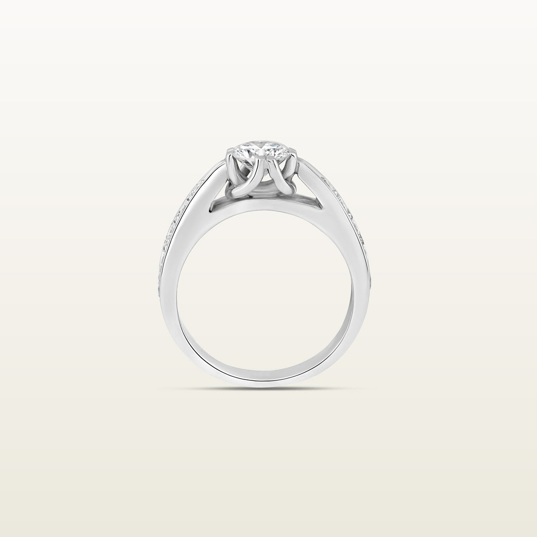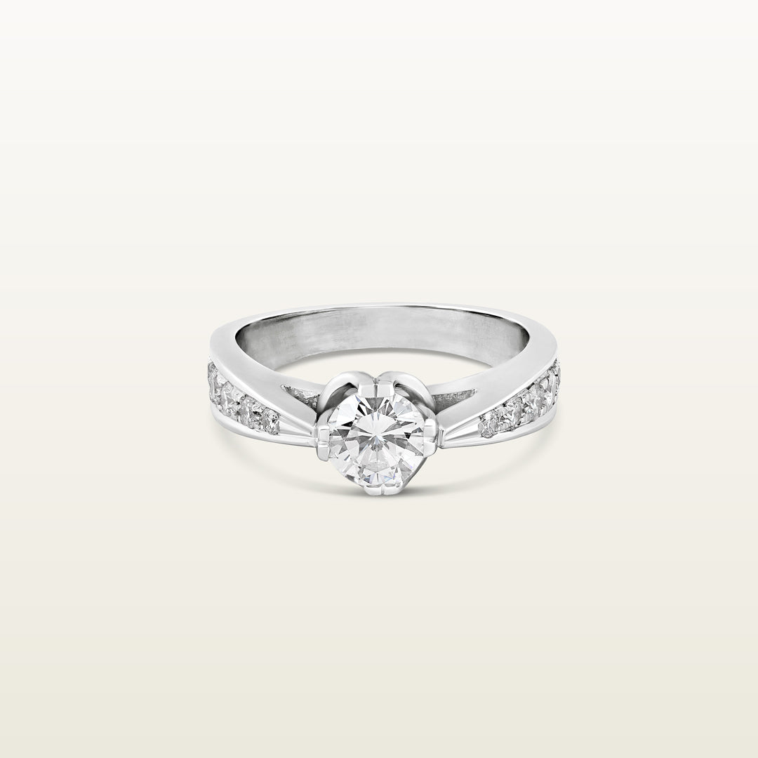 Anillo de compromiso Solitario, en oro blanco 18 kt con un diamante natural en el centro, corte Brillante Redondo (Round Brilliant Cut) de 0.61 ct. acompañado de 10 diamantes naturales laterales corte Brillante Redondo (Round Brilliant Cut) con un peso de 0.35 ct. Peso total de los diamantes 0.95 ct.