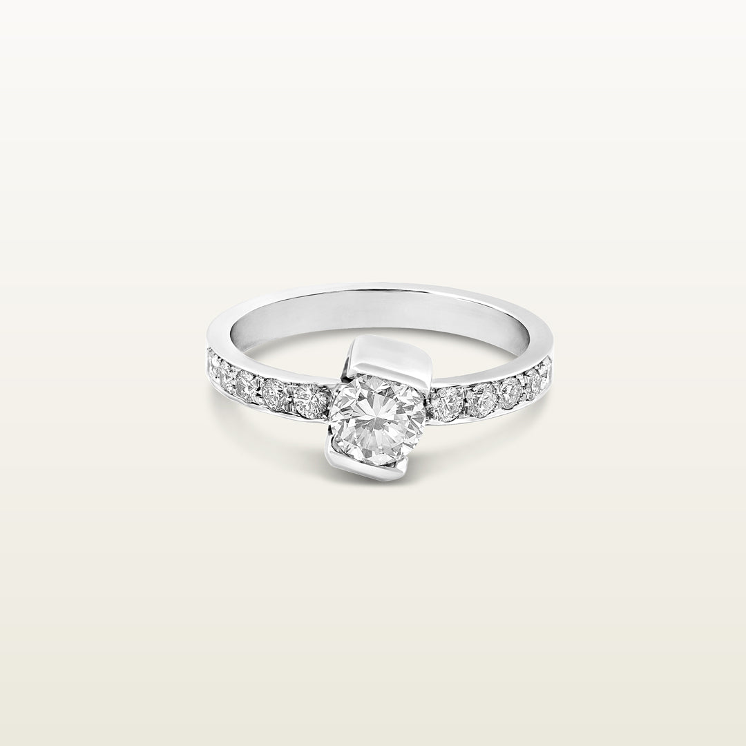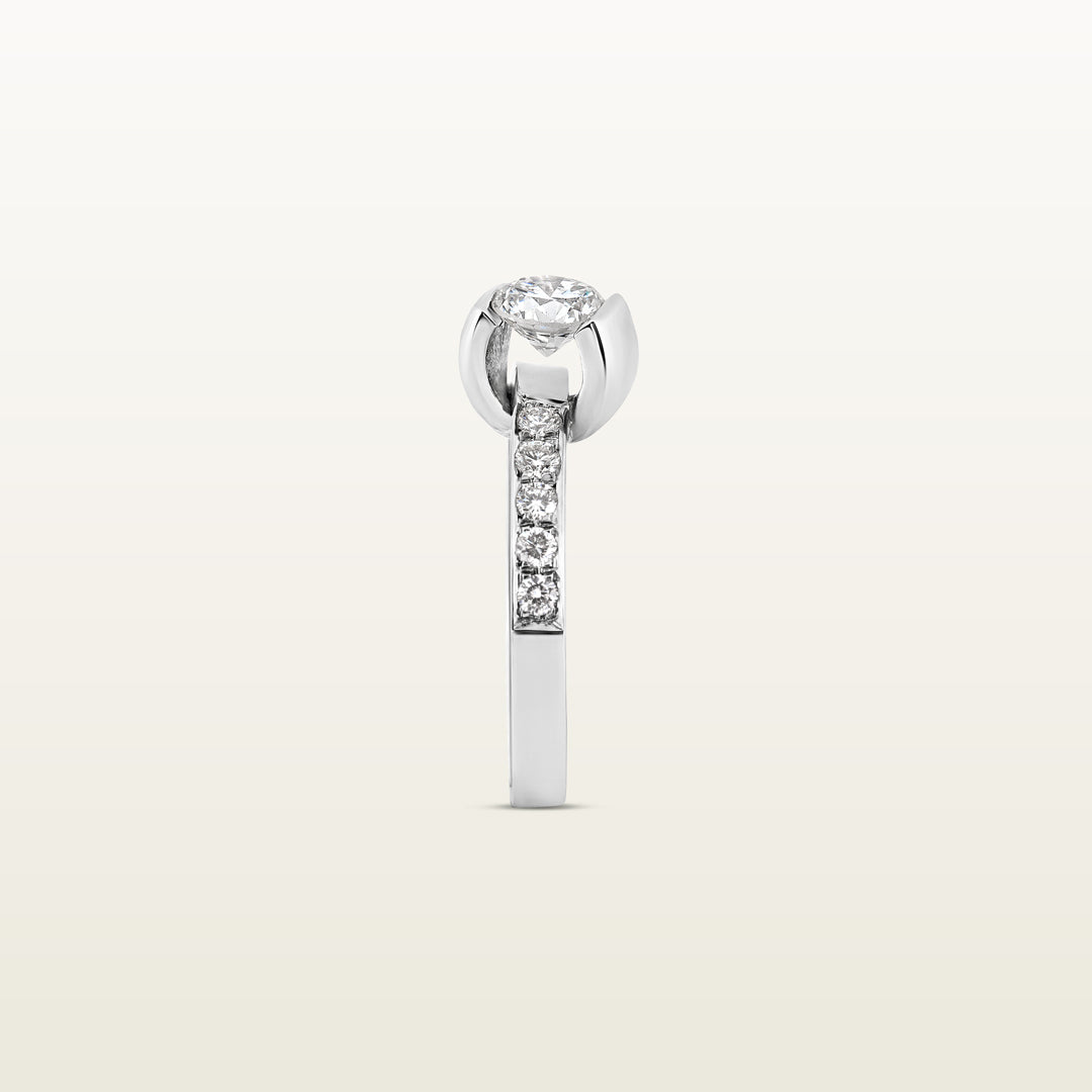 Anillo de compromiso Solitario, en oro blanco 18 kt con un diamante natural en el centro, corte Brillante Redondo (Round Brilliant Cut) de 0.52 ct. acompañado de 10 diamantes naturales laterales corte Brillante Redondo (Round Brilliant Cut) con un peso de 0.15 ct. Peso total de los diamantes 0.67 ct.