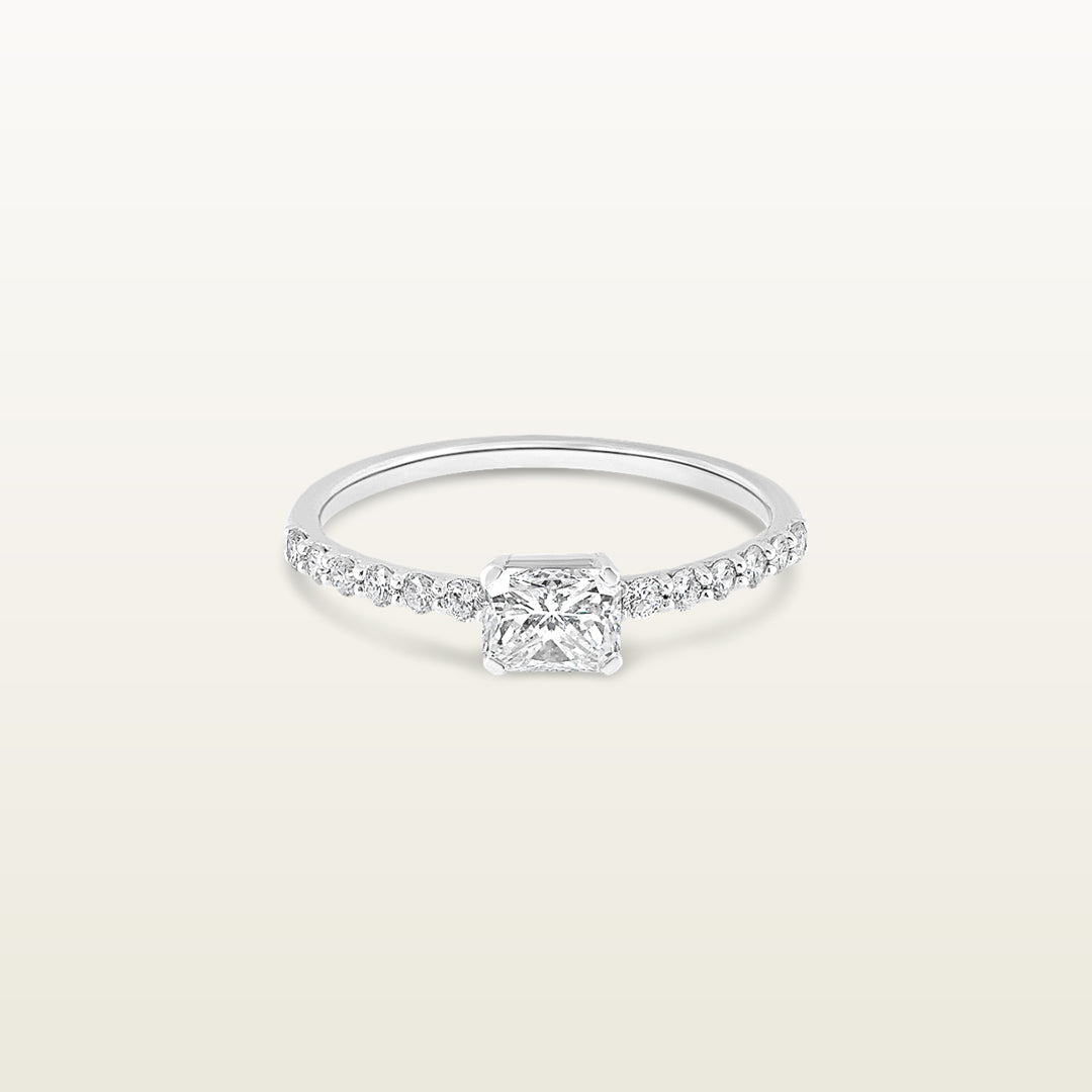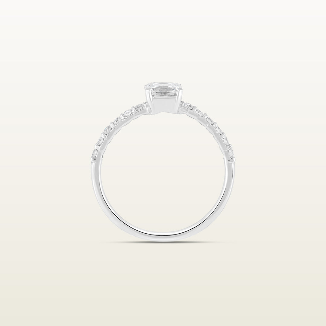 Anillo de compromiso Solitario, en oro blanco 18 kt con un diamante natural central corte Radiante (Radiant Cut) de 0.47 ct. acompañado de 12 diamantes laterales corte Brillante Redondo (Round Brilliant Cut) con un peso total de 0.16 ct.