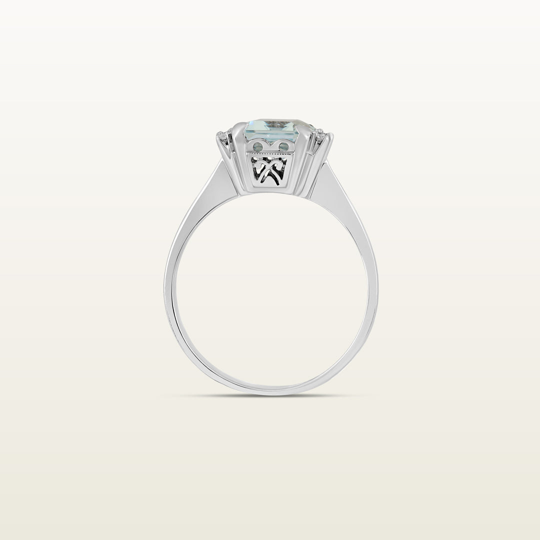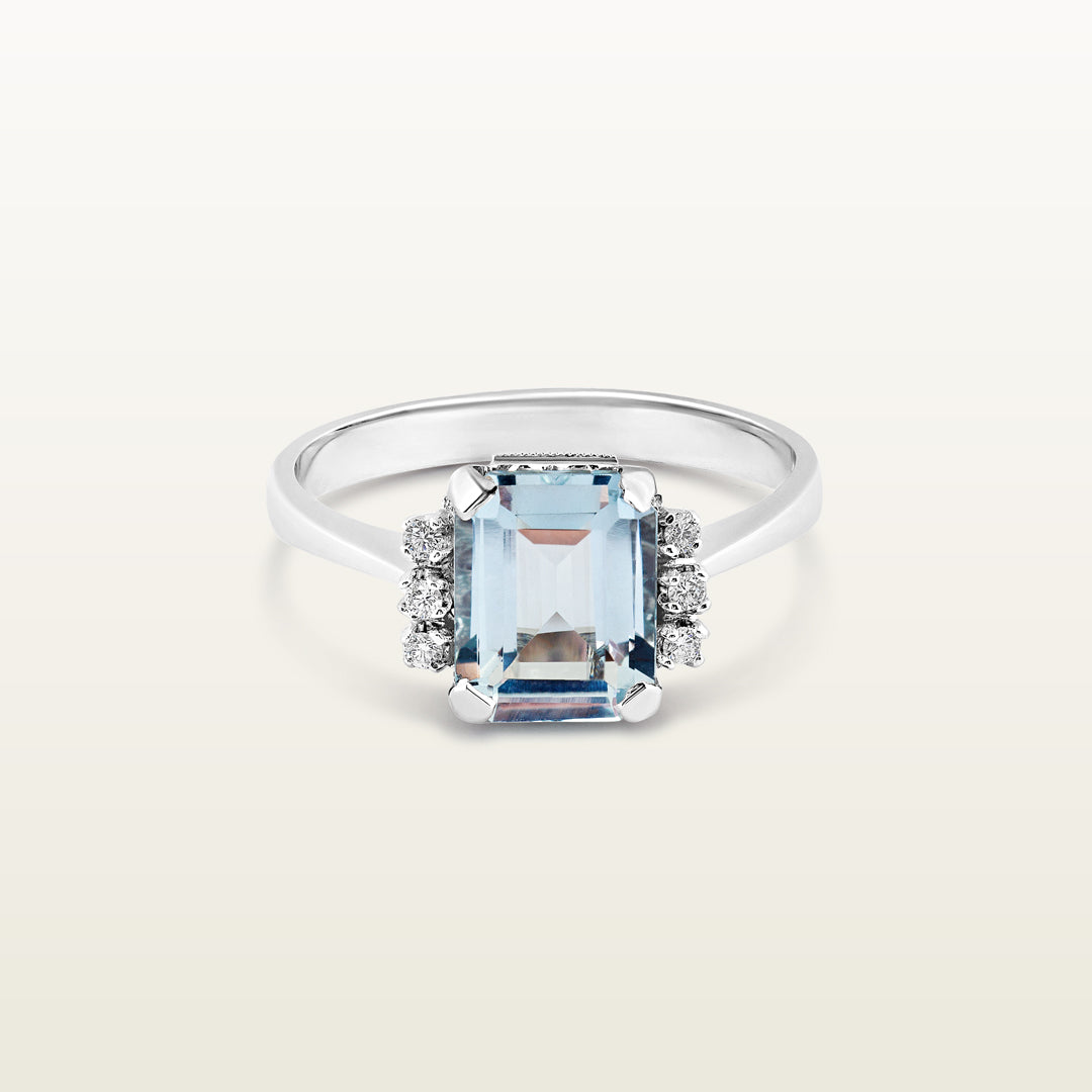 Anillo en oro blanco 18 kt con una aguamarina central de 2.05 ct rodeada de seis diamantes naturales corte Brillante Redondo (Brilliant Round Cut) 0.07 ct.