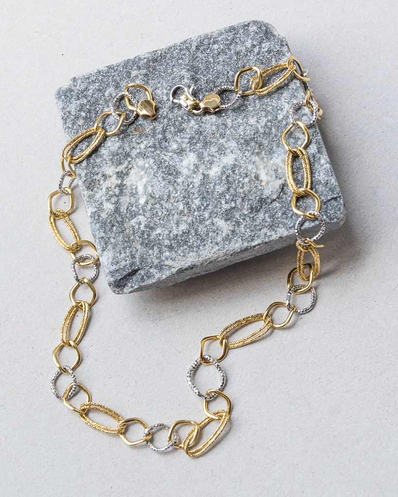 - Gargantilla en dos tonos de oro, amarillo y blanco 18 Kilates 18Kt/18K de anchos eslabones doble clip y rombos, lisos y texturizados intercalados