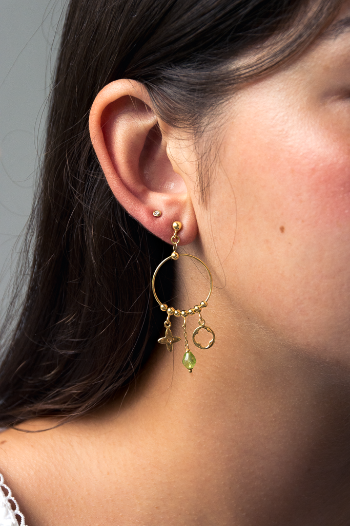 - Zarcillos aro en oro amarillo 18 Kilates 18Kt/18K con con dijes y topacios verdes facetados