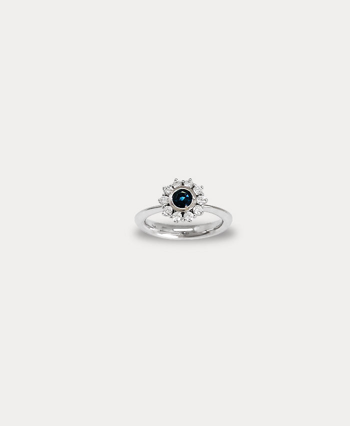 Anillo en oro blanco 18 kt con un zafiro central de 0.64 ct rodeado de 10 diamantes naturales corte Brillante Redondo (Round Brilliant Cut) 0.34 ct.