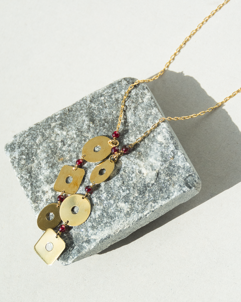 Gargantilla en oro amarillo con figuras geométricas y amatistas intercaladas