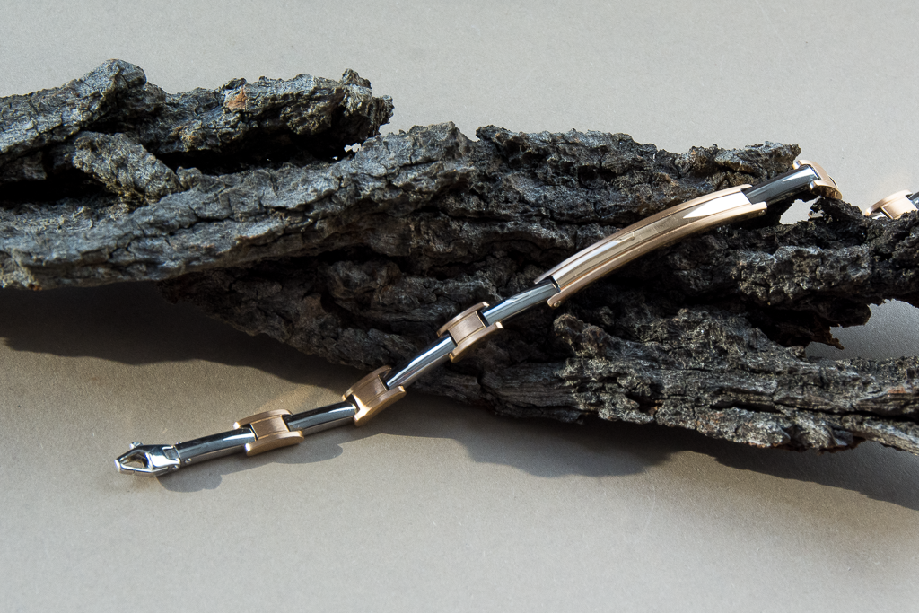 Pulsera tejido italiano en oro amarillo y rosado de eslabones articulados planos y placa